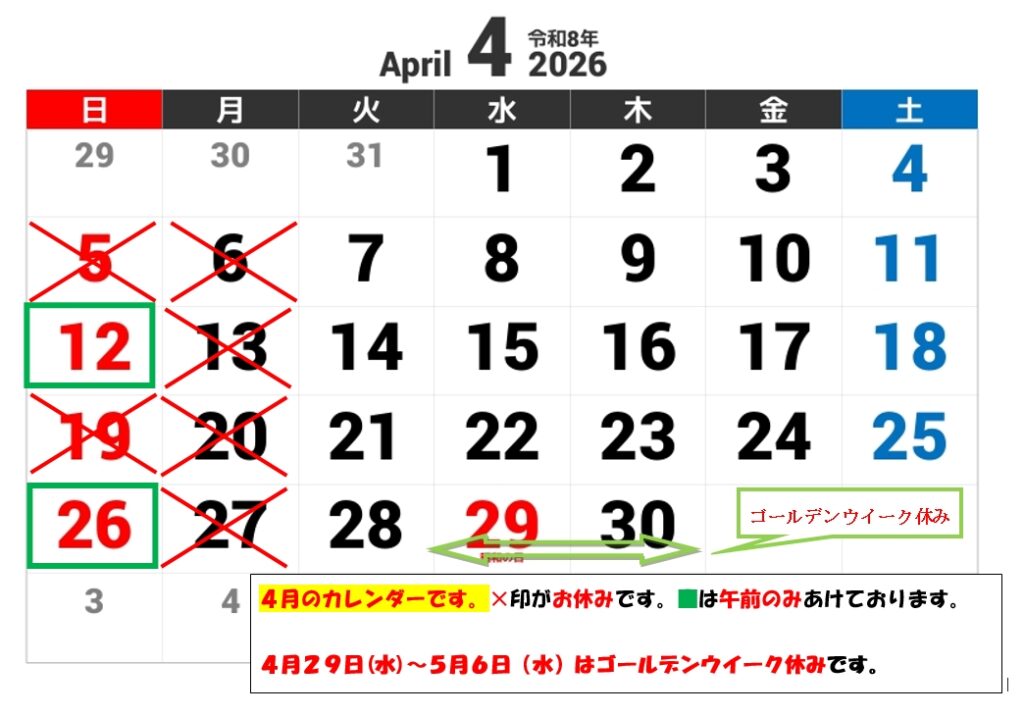 カテゴリー ブログ 4月のカレンダー 投稿者 作成者: star 投稿日 2026年3月26日 4月のカレンダーです。 4月29日(水)~5月6日(水)はゴールデンウイーク休みです。 ← 黒毛和牛ランチ「うしの舎」
